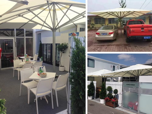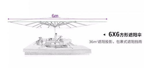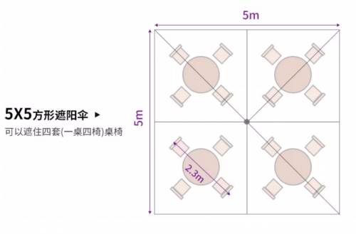 5x5米实用典范: 一把伞即可完整覆盖四套(一桌四椅)桌椅,让欢声笑语在清凉中流淌。